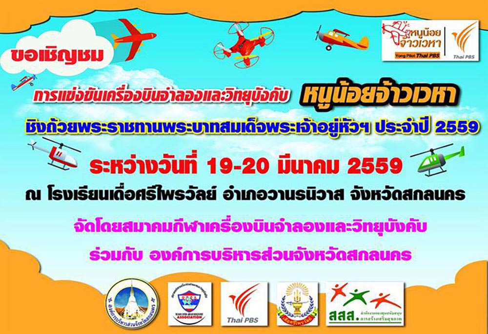 ชิงถ้วยพระราชทานพระบาทสมเด็จพระเจ้าอยู่หัว ประจำปี 2559 ระหว่างวันที่ 19-20 มีนาคม พ.ศ. 2559 ณ โรงเรียนเดื่อศรีไพรวัลย์ อำเภอวานรนิวาส จังหวัดสกลนคร 47120 จัดโดยสมาคมกีฬาเครื่องบินจำลอง และวิทยุบังคับร่วมกับองค์การบริหารส่วนจังหวัดสกลนคร ไทยพีบีเอส ถ่ายทอดสด การแข่งขันเครื่องบินจำลองและวิทยุบังคับ หนูน้อยจ้าวเวหา มัธยมต้น สดจาก โรงเรียนเดื่อศรีไพรวัลย์ อ.วานรนิวาส จ.สกลนคร วันอาทิตย์ที่ 20 มีนาคมนี้ เวลา 14.05 - 16.00 น. ทางไทยพีบีเอส หรือรับชมทีวีออนไลน์ทาง www.thaipbs.or.th/Live