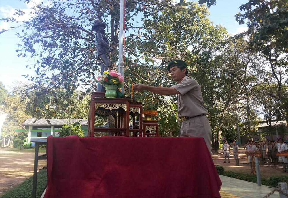 นายสุทัศน์ สุวรรณโน ผู้อำนวยการโรงเรียนเดื่อศรีไพรวัลย์ เป็นประธานในพิธีทบทวนคำปฏิญาณและสวนสนามของลูกเสือ ประจำปี 2558 เนื่องในวันคล้ายวันสถาปนาคณะลูกเสือแห่งชาติ