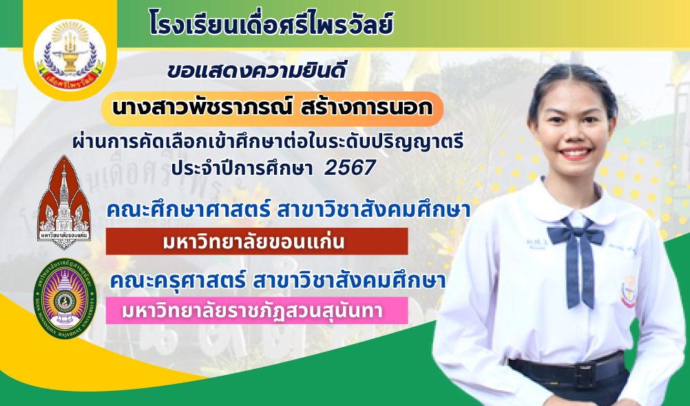 นางสาวพัชราภรณ์ สร้างการนอก นักเรียนโรงเรียนเดื่อศรีไพรวัลย์ อำเภอวานรนิวาส จังหวัดสกลนคร ได้รับคัดเลือกเข้าศึกษาต่อ คณะศึกษาศาสตร์ (ค.บ.) สาขาวิชาสังคมศึกษา มหาวิทยาลัยขอนแก่น โครงการผลิตครูดี 50 ศึกษาศาสตร์ มข ติดสัมภาษณ์ตัวจริง